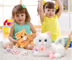 Preslatka interaktivna mačka s dva mačića i bočicom donosi sate zabave i umirujućeg maženja. Zahvaljujući funkcijama poput snimanja i reprodukcije, mjaukanja i predenja, melodija i pjesmica te reakcija na maženje i hranjenje, djeca uče brinuti i razvijati maštu. Mačići su skriveni u maminoj trbuščiću, a igračka je izrađena od mekanog, ugodnog pliša.