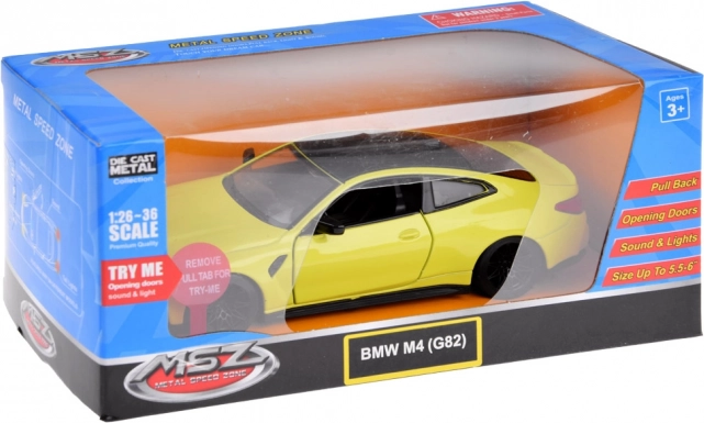Kolekcionarski metalni model BMW M4 u mjerilu 1:32 oduševit će djecu i odrasle. Ima otvarajuća vrata, realistične svjetlosne efekte (prednja, stražnja svjetla i osvijetljena instrumentna ploča) te zvuk motora, trube i alarma. Zahvaljujući frikcijskom pogonu dovoljno je autić potegnuti po glatkoj podlozi i krenut će naprijed.
