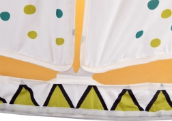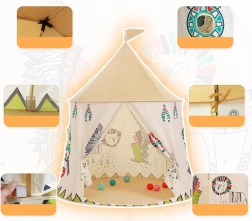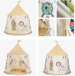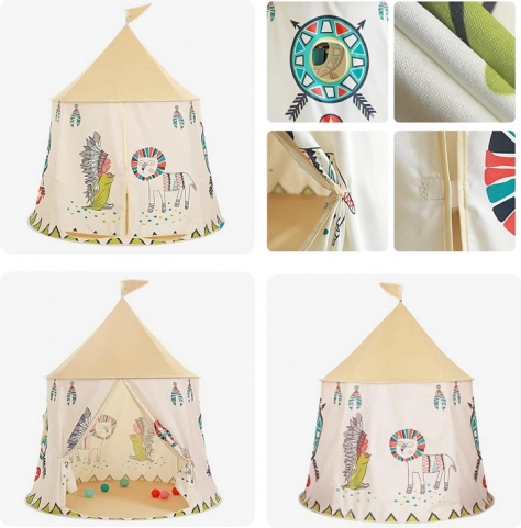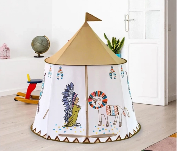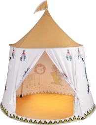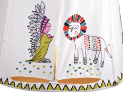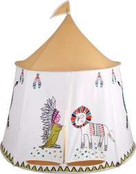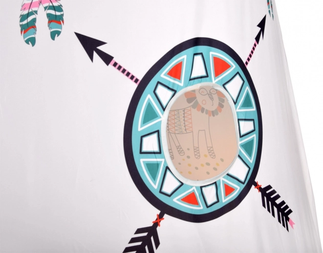 Ovaj okrugli tipi s razigranim indijanskim otiscima pretvara sobu u čarobni kutak za čitanje, igru uloga i odmor. Laka konstrukcija osigurava jednostavnu montažu/demontažu i premještanje po potrebi, dok prozračna tkanina pruža ugodnu klimu tijekom igre.