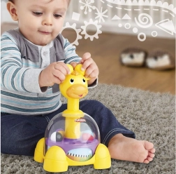 Upoznajte svoje dijete s fascinantnim svijetom boja i kretanja zahvaljujući PlaySkool Žirafinom Vrtljivom Tornju. Ova igračka je dizajnirana kako bi poticala razvoj motoričkih vještina i učenje uzroka i posljedice. Dijete pritisne glavu žirafe i promatra kako kuglice unutra plešu i vrte se.