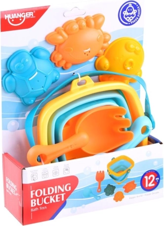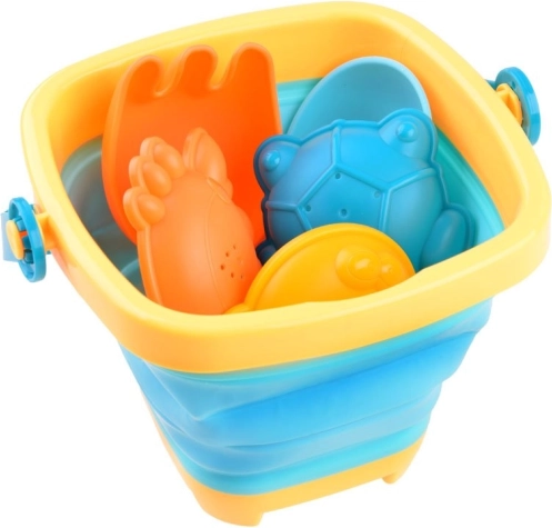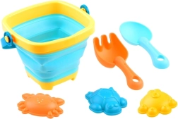 Sadrži sve što djeca trebaju za kreativnu igru u pijesku: sklopivu kantu, lopaticu, grablje i tri kalupa.