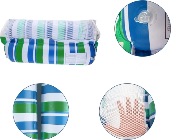 Kombinacija plave, zelene i bijele boje čini je estetski privlačnom i funkcionalnom. Posebna najlonska mrežica omogućuje protok vode, čime se povećava udobnost tijekom korištenja.