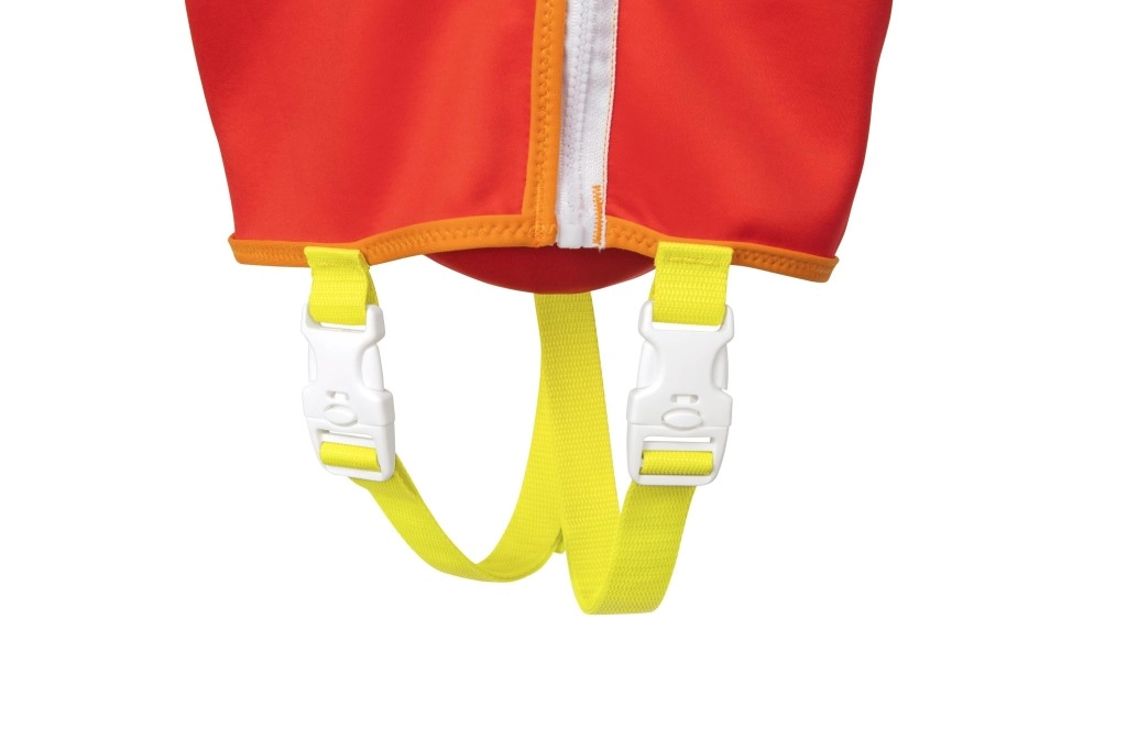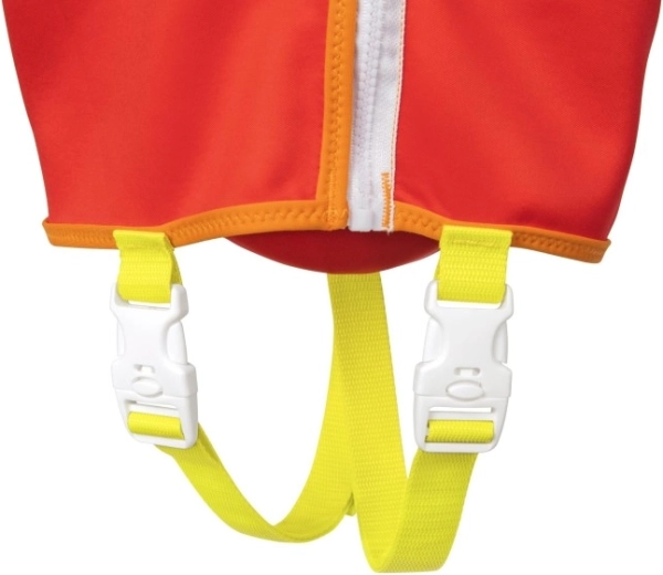 Veliki oslonac za glavu pomaže zadržati djetetovu glavu iznad površine, podesivi remeni s kopčama za brzo otpuštanje i međunožni remen osiguravaju čvrsto i sigurno pristajanje. Praktična stražnja ručka omogućuje dijete lako pridržati ili brzo izvući iz vode.