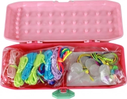 - Ružičasta futrola, šareni končići, elastične gumice, perlice (uključujući okrugle), plastični klinići, naljepnice, upute