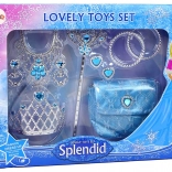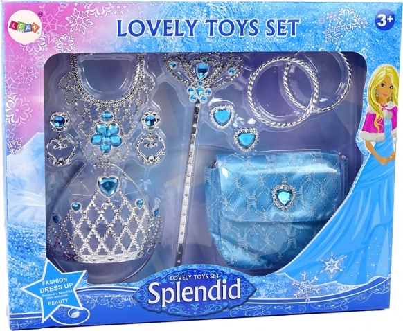 Sadrži elegantnu torbicu s otvaranjem, prekrasnu elastičnu krunu i štapić, koji princezi daju poseban izgled. Nadalje, set uključuje stilske dodatke poput ogrlice, narukvica, prstenova i naušnica – sve što je potrebno za kraljevski izgled.
