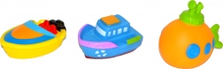 Ovaj simpatični set za vodu donosi djeci puno zabave tijekom kupanja. Dva brodića i podmornica izrađeni su od mekane gume koja je ugodna na dodir i sigurna čak i za one najmlađe. Zahvaljujući kompaktnoj veličini od 8 cm, igračke se lako drže i prikladne su za prvo istraživanje vode.