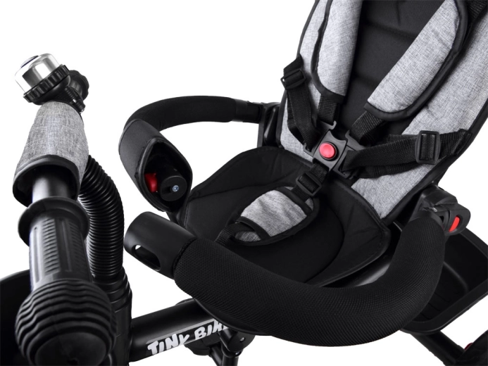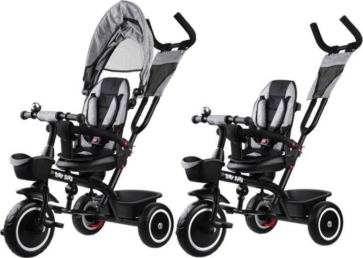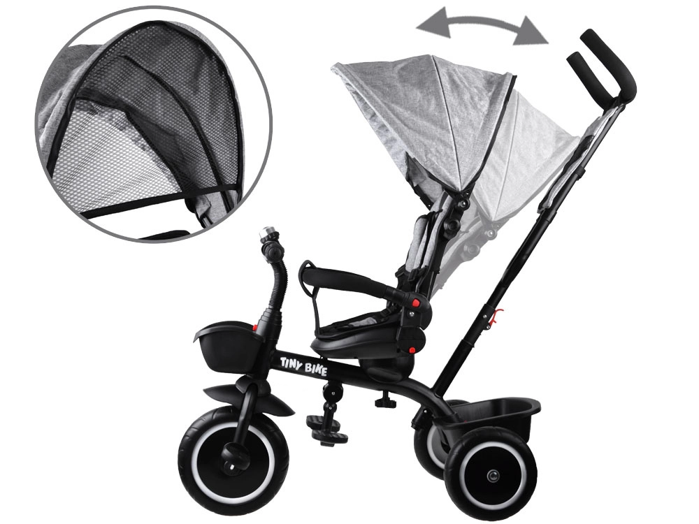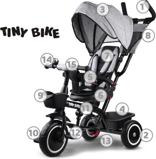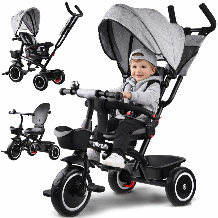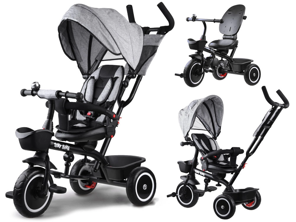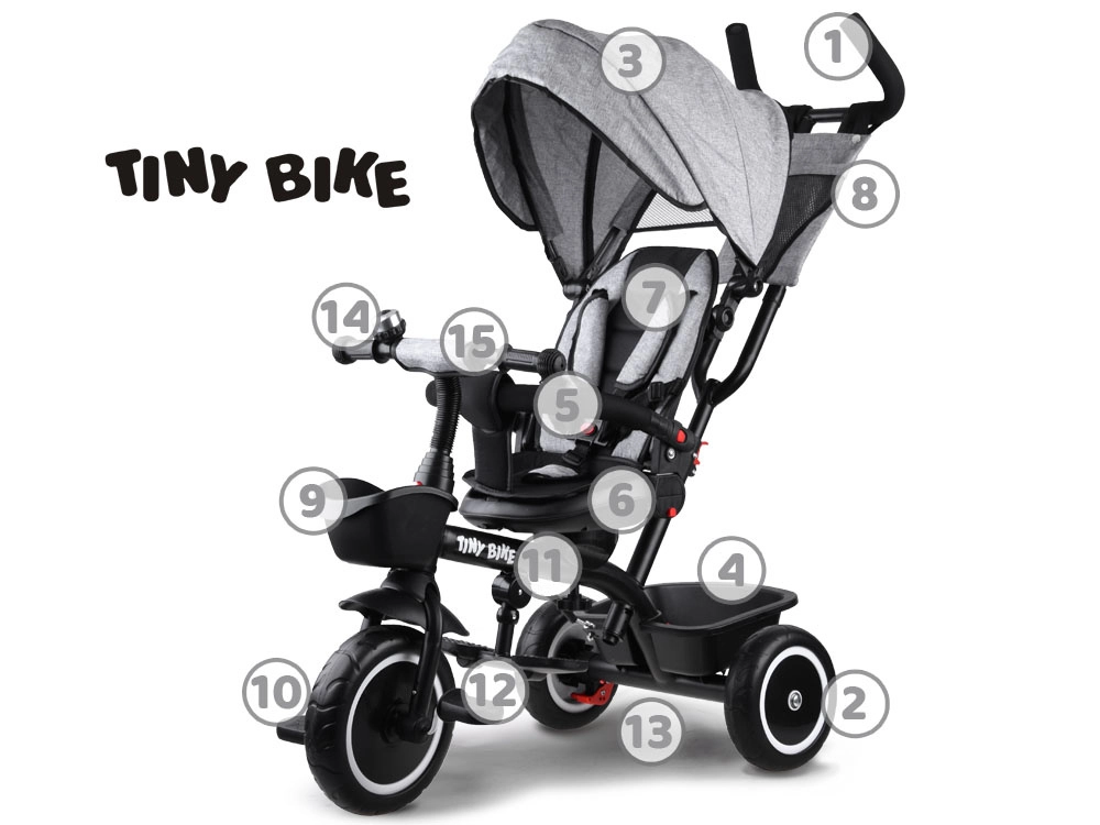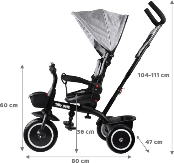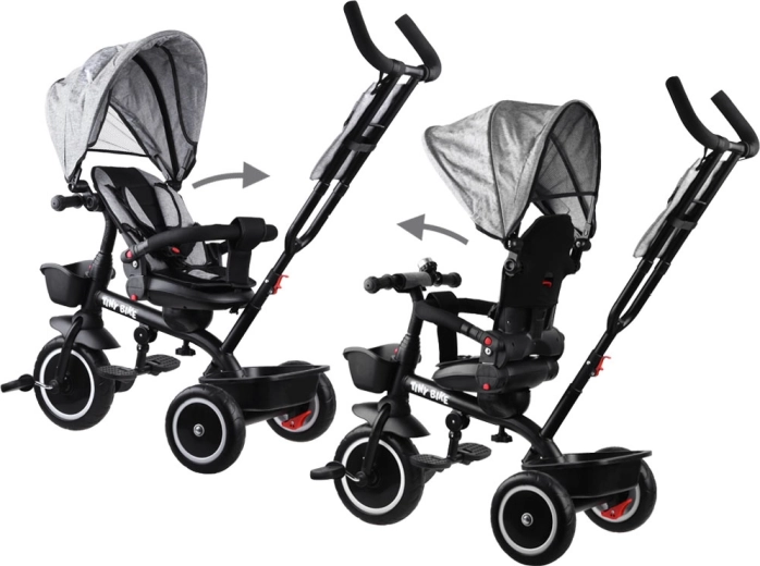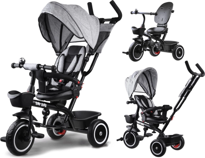 Multifunkcionalna dječja trokolica 3u1 TINY BIKE s okretnim sjedalom kombinira funkciju gurane trokolidice, kolica i samostalnog bicikla na pedale. Nudi 5-točkovni pojas, sklopivi sunčani krov s mrežicom, bezodržavna EVA kotača, stražnje kočnice i bogatu opremu za udobne i sigurne vožnje od 6 mjeseci do otprilike 5 godina.