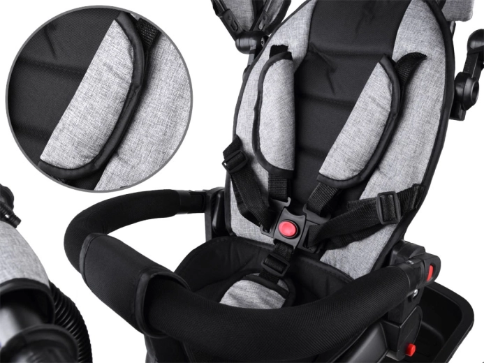 Trokolica 3u1 raste zajedno s djetetom: od načina s roditeljskim vođenjem preko prvog pedaliranja do samostalne vožnje. Okretno i podesivo sjedalo s mekim presvlakama, 5-točkovni sigurnosni pojasevi i podstavljena sigurnosna prečka pružaju maksimalnu sigurnost i udobnost. Sklopivi krov sa stražnjom mrežicom prozračuje i štiti od sunca, vjetra i lagane kiše.