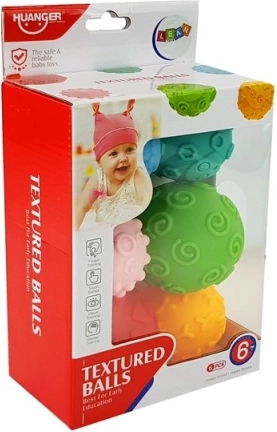 .Set od 6 različitih loptica razlikuje se po teksturi, veličini i izbočinama na lopticama. Kada ih vaše dijete uzme u ruku, stimulira osjet dodira i duboki osjet. Dodatna prednost je učenje o različitim teksturama i geometrijskim oblicima. A što će raditi s kuglicama, ovisi samo o njegovoj mašti. Razvijat će koordinaciju ruka-oko, vid i preciznost, jer na početku života djetetu nije lako držati loptu u ruci. Osmijeh na licu vašeg djeteta i doprinos ove jednostavne, ali edukativne igračke donijet će vam radost zbog napretka vašeg djeteta.