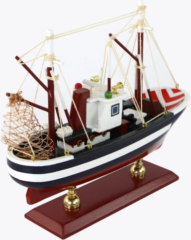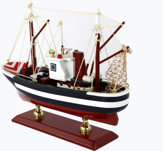 Elegantni drveni model ribarskog koćara s detaljno izrađenim visokim jarbolima, realističnom ribarskom mrežom i kabinom s trubama i signalnim svjetlima. Plava izvedba s bijelim prugama i tipičnim bijelo‑crvenim uzorkom na pramcu djeluje bezvremenski. Stabilne drvene nožice osiguravaju sigurno izlaganje na polici ili stolu. Idealno kao poklon‑dekoracija za ljubitelje mora i kolekcionare.