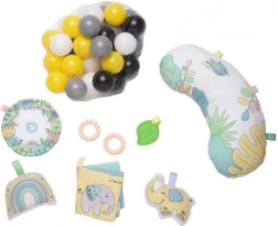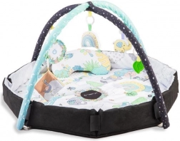 Edukativna podloga dolazi s igračkama koje se mogu objesiti na luk ili koristiti zasebno. U kompletu su: zrcalce, grizalo i šuškava knjiga. Dio podloge je i jastučić u obliku kroasana koji će vašem djetetu pomoći pri prvim pokušajima puzanja.