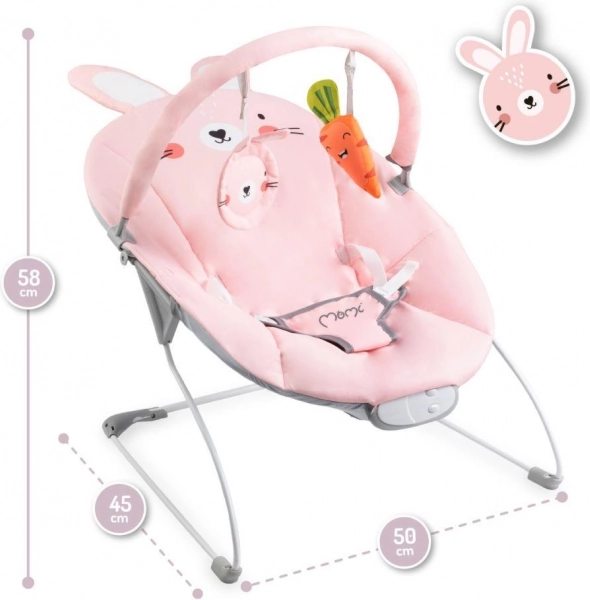 MoMi Glossy je praktična vibrirajuća ležaljka osmišljena za najmlađe od rođenja do 6 mjeseci. Zahvaljujući kompaktnoj i laganoj konstrukciji lako je prenosiva i sklopiva, pa je možete koristiti kod kuće i u gostima. Šarmantan dizajn ružičastog zečića razveselit će djecu, dok će roditelji cijeniti stabilnost i jednostavno održavanje.