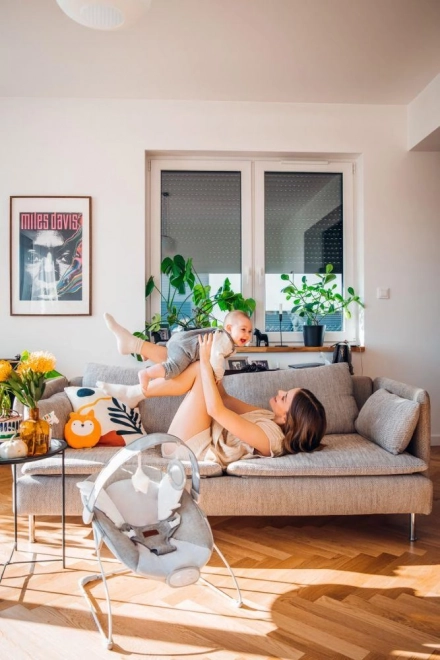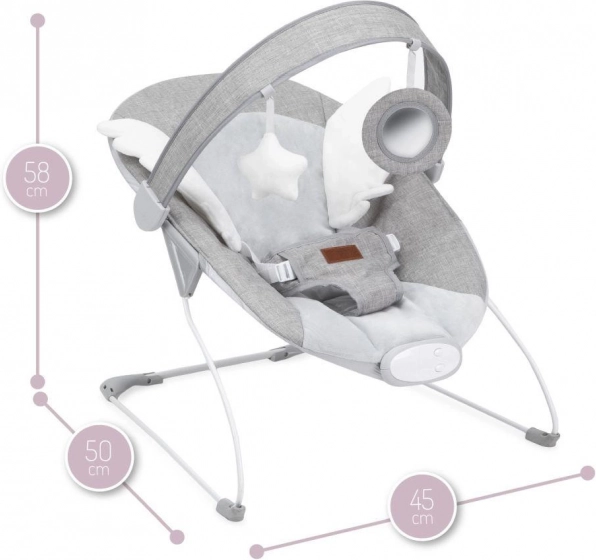 MoMi TULI je ležaljka osmišljena za udobnost i razvoj osjetila. Mekana navlaka, baršunasta krilca i prirodno ljuljanje umiruju dijete, dok vibracijska jedinica i melodije pružaju nježnu stimulaciju. Odvojiva ručka s podesivim kutom i dvije igračke potiču zabavu i koordinaciju.
