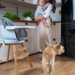 Široka podesiva prednja ploča prirodno podupire leđa i održava M‑položaj nožica, koji je nježan za zglobove kukova. Naslon za glavu stabilizira osjetljivo područje vrata.