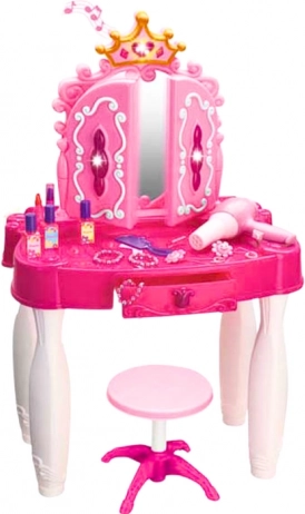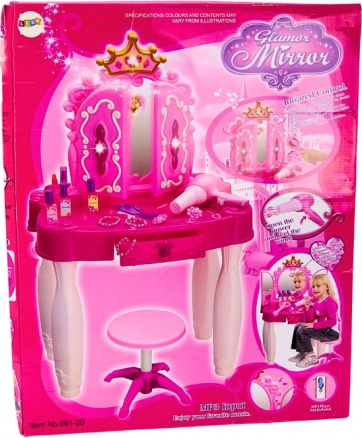Pustite dijete da zakorači u svijet mašte s toaletnim stolićem čije se ogledalo nakon zamaha čarobnim štapićem zasvijetli i prati ga melodijama i treperećim svjetlima. Zahvaljujući ulazu za MP3 tijekom šminkanja i zabave s frizurama može svirati omiljena glazba.