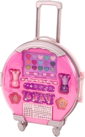 Ovaj ružičasti kozmetički set za djecu dolazi u preslatkom kovčegu na kotačićima s izvlačnom ručkom, tako da ga mali vizažisti mogu ponijeti bilo kamo. Unutra čeka bogata oprema: paleta s 15 nijansi sjenila za oči (8 blago sjajnih, 2 mat, 5 izrazito sjajnih), 2 laka za nokte (sjajna ljubičasta i klasična ružičasta), 2 sjajila za usne, naljepnice za nokte i praktični alati.