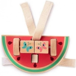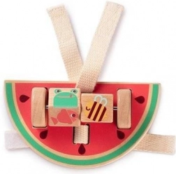 Šarena igračka u obliku lubenice, opremljena metalnom šipkom s okretnim kockicama, nudi zabavu i podržava razvoj fine motorike kod djece.