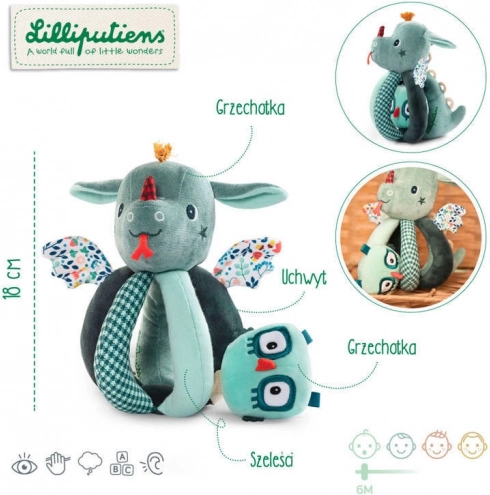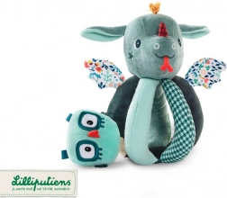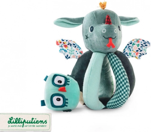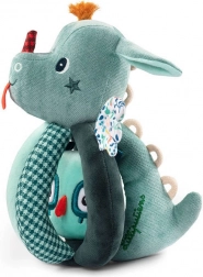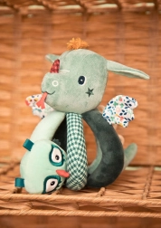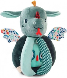 Upoznajte zmaja Joea – šarenog prijatelja za prve spoznaje. Tijelo u obliku kuglice čini pet mekih držača, jedan s ljuskicama na leđima, krila od raznih materijala i odvojiva sovica sa skrivenom zvečkicom. U glavici je zvonka zvečkica, a dodatne zvukove pruža šušteći materijal. Igračka potiče hvatanje, trešnju, umetanje i izvlačenje, stimulira vid, sluh i dodir.