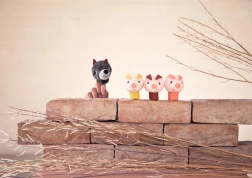 Tri šarena praščića i sivi vuk kao lutkice za prste od meke tkanine. Ugodne na dodir, idealne za igrokaze kod kuće i u vrtiću.