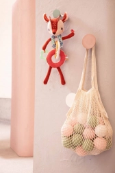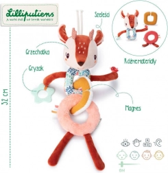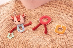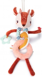 Svaki je dio od druge tkanine (npr. vezena šnura, mekane „frou-frou” dlačice), što potiče taktilnu percepciju. Duge nožice, uši, roščići i vrpce mame na istraživanje, stiskanje, hvatanje i potresanje. Lanac lako pričvrstite pomoću vezica na glavici – na kolica, autosjedalicu ili nosiljku. Igračka je kvalitetno izrađena, sigurna i periva u perilici na nježnom programu do 30 °C.