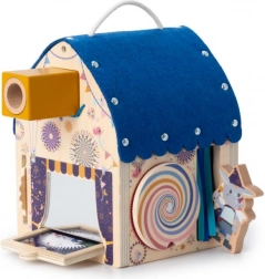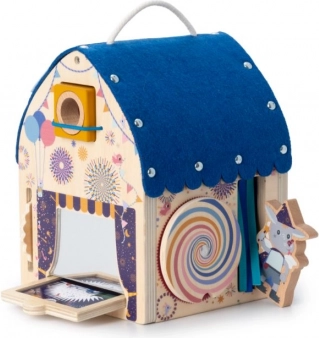 Kućica je pažljivo izrađena od FSC certificirane bukove šperploče i tekstilnih dodataka koji igri daju taktilnu raznolikost. Površinu je lako čistiti, pa je spremna za svakodnevnu igru. Idealna kao edukativna igračka za razvoj vida, koordinacije oko–ruka i koncentracije.