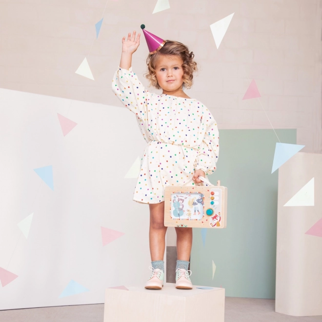 Ova originalna glazbena kutija Lilliputiens osmišljena je za male istraživače. Dovoljno je okrenuti upravljački gumb i mali orkestar započet će veselu melodiju, tijekom koje se aktiviraju i ilustracije. Djeca tako prirodno vježbaju koordinaciju oko–ruka, sluh i vid.