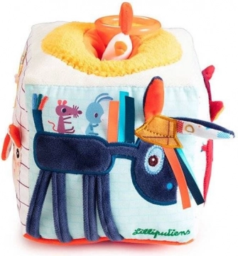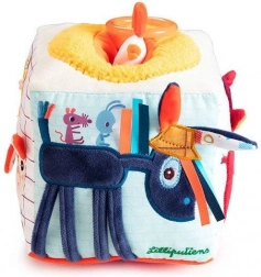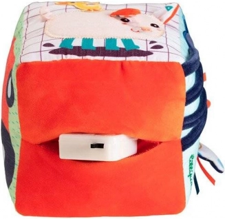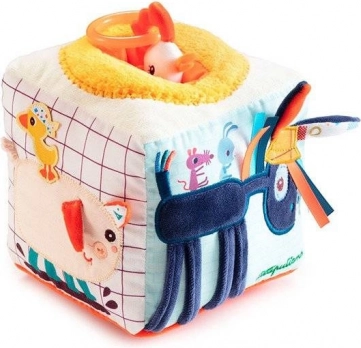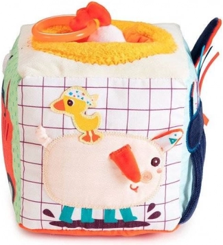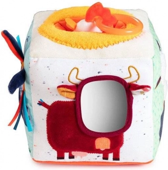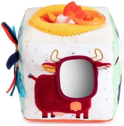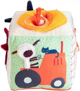 Ova mekana kocka puna je iznenađenja: kravnica Rosalie sa zrcalcem, ovčica Yvon na traktoru, patak Gaston na praščiću Simoni, magarčić Ignace s bogatom grivom od trakica i kokica Paulette u svom mekom gnijezdu. Kada se protrese, kocka proizvodi zvukove domaćih životinja – zadatak djeteta je pronaći kojem junaku pripadaju.