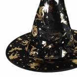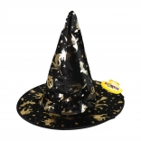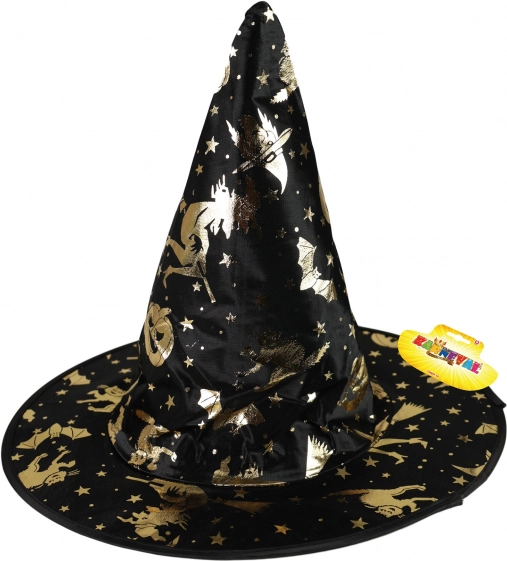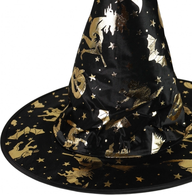 Stilski dječji čarobnjački šešir idealan je za karneval, priredbe i Noć vještica. Crni tekstilni šešir krase zlatni magični motivi poput zvijezda, šišmiša i vještica. Zahvaljujući klasičnom stožastom obliku i širokom obodu lako upotpunjuje svaki kostim i pretvara malog čarobnjaka u zvijezdu Noći vještica.