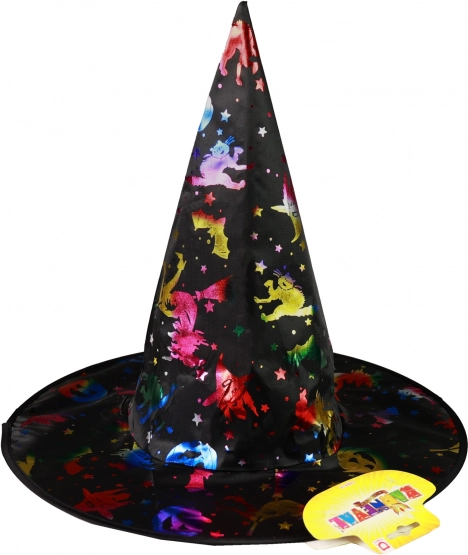 Postanite zvijezda zabave s ovim stilskim vještičjim šeširom. Crni šešir ukrašen je šarenim holografskim simbolima koji mu daju magičan izgled.