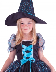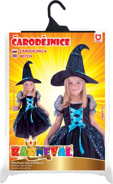 Očaravajući dječji kostim vještice u plavo-crnoj izvedbi pretvorit će svaku malu čarobnicu u zvijezdu zabave. Haljina se presijava s metalnim zvjezdicama, ukrašena je tirkiznom vrpcom i dolazi s usklađenim čarobnjačkim šeširom. Idealno za karneval, Halloween i bajkovite preobleke.