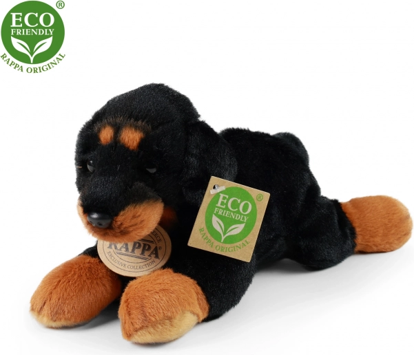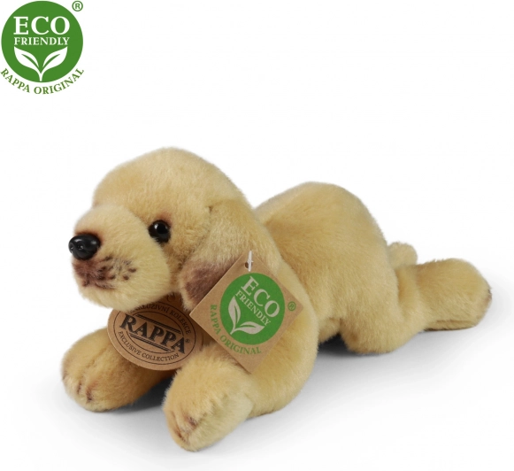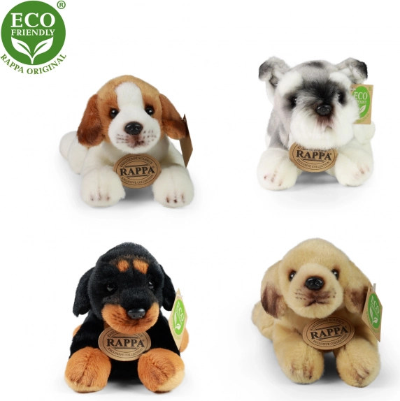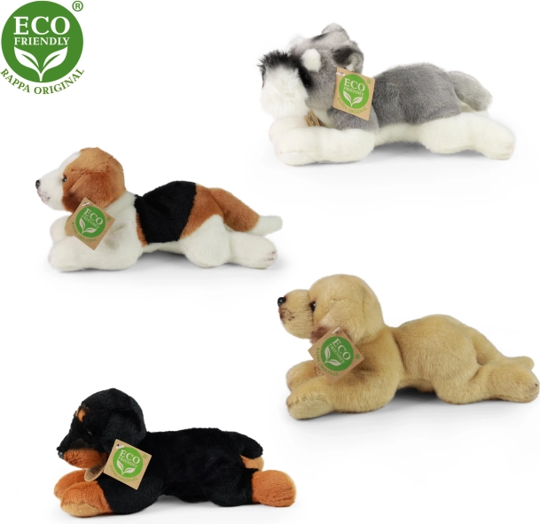 Plišani pas ležeći veličine 16 cm, dostupan u raznim rasama, kao što su bigl, bradonja, labrador ili rotvajler. Izrađen od ekoloških materijala koji zadovoljavaju sve sigurnosne standarde.