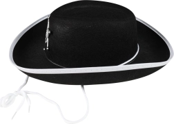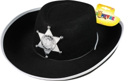 Dajte kostimu malog kauboja autentičan izgled. Ovaj dječji kaubojski šešir u elegantnoj crnoj boji krasi upečatljiva šerifska zvijezda i bijeli obrub koji pruža stilski kontrast. Vezica ispod brade osigurava da šešir dobro stoji i pri razigranoj zabavi.