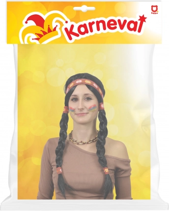 Perika uključuje modernu traku za kosu i uzorkovane vrpce na pletenicama koje naglašavaju indijanski izgled i daju kostimu jedinstven karakter.