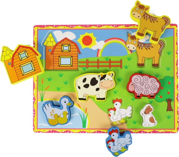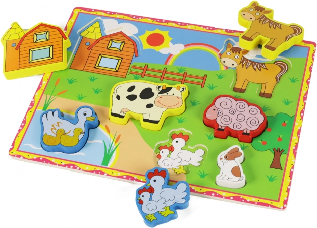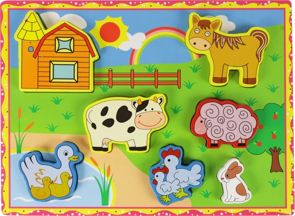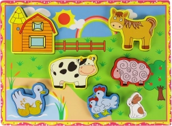 Drvena slagalica s farmerskim životinjama odličan je alat za razvoj motoričkih sposobnosti vašeg djeteta. Zahvaljujući ovoj igri djeca uče prepoznavati oblike i životinje. Osim toga: