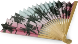 Lepeza oduševljava svojim tropskim motivom palmi na šarenoj pozadini, koji donosi osvježenje i egzotičan ugođaj svakom danu.
