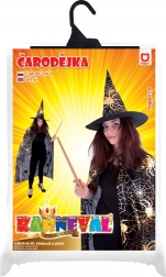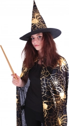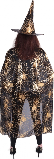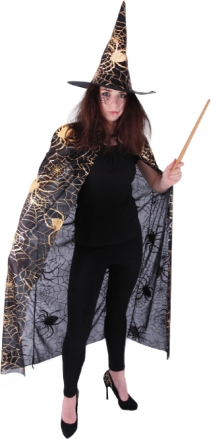Stilski vještičji plašt i šešir s blještavim zlatnim tiskom paučina pretvorit će svaku kostimiranu večer u magičan događaj. Zahvaljujući univerzalnom kroju i laganom materijalu, udobno se nosi i lako kombinira s ostalim dodacima. Idealno za Noć vještica, maskenbal, cosplay i tematska fotografiranja.