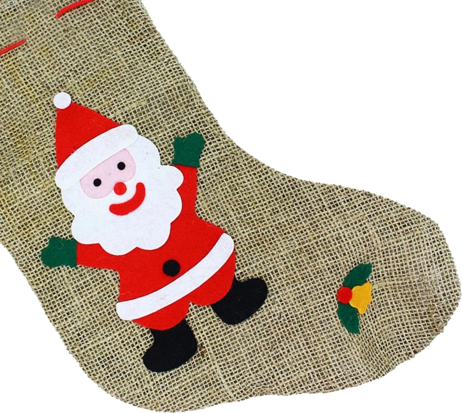 Tradicionalna mikulaška čarapa od jutene vrećine s praktičnim omčom i ukrasnim tiskom. U prostranu čarapu stane puno slastica i sitnih poklona. Idealno za Svetog Nikolu i Božić, sigurno za djecu od 3 godine, veličina 38 cm.