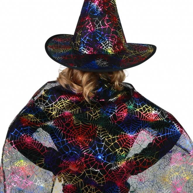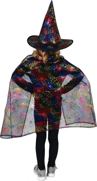 Očarajte male čarobnjake i vještice stilskim kostimom s plaštom i šeširom ukrašenima metalnim paukovim mrežama u duginim bojama. Lagani i udobni set za Noć vještica, karneval i tematske zabave, idealan za djecu 3–7 godina.