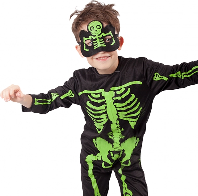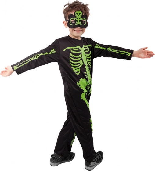 Stilizan dječji kostim kostura s upadljivim neonski zelenim kostima na crnoj podlozi. Idealno za Noć vještica, karneval i tematske zabave. U kompletu su kombinezon i maska za potpuni jezivi izgled. Udoban materijal, lako oblačenje i efektan neonski tisak osiguravaju puno zabave i pažnje.