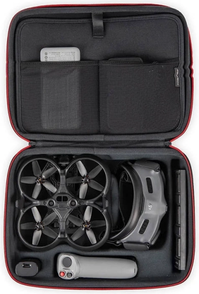 Dizajnirano tako da se udobno smjesti: DJI AVATA, DJI Goggles 2, DJI daljinski upravljač, do 5 baterija, punjač i sitnice poput filtera ili memorijskih kartica. Izdržljivi materijali PU + EVA i povećana otpornost na prskanje vodom osiguravaju pouzdanu zaštitu u promjenjivim uvjetima.