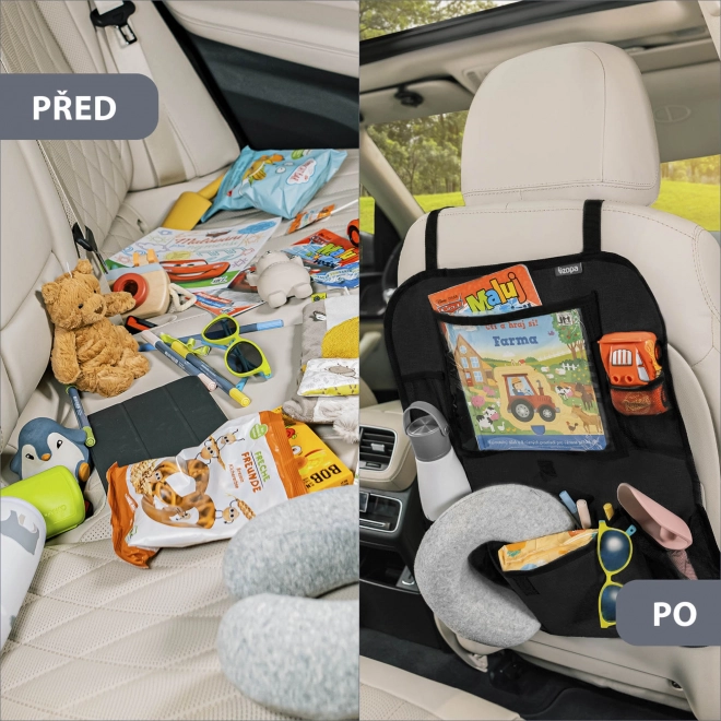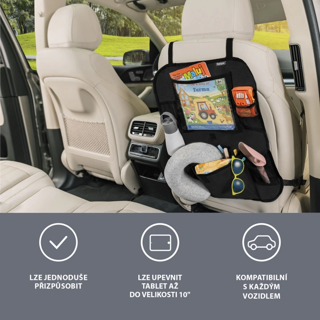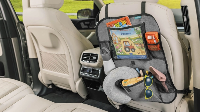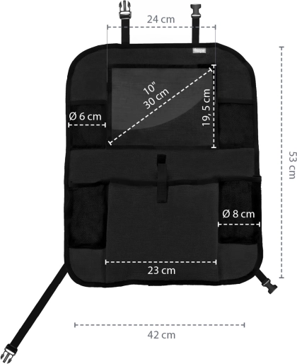 Praktični organizator za stražnju stranu sjedala s prozirnim džepom za tablet idealan je za obiteljska putovanja. Nudi brz pristup tabletu, zaštitu zaslona osjetljivog na dodir i dovoljno prostora za pohranu za sitnice i napitke. Univerzalno pričvršćivanje s podesivim kopčama osigurava kompatibilnost s većinom vozila.