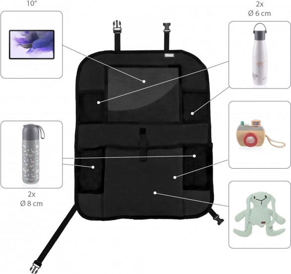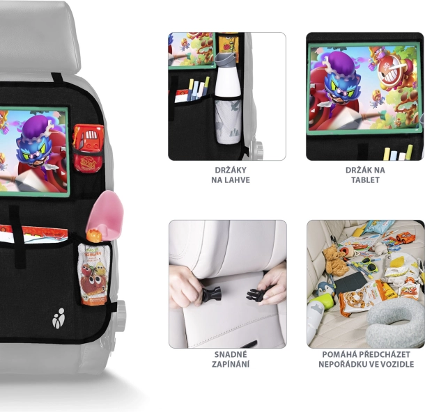 Ovaj organizator drži sve pod kontrolom tijekom kratkih i dugih vožnji. Prozirni prozor za tablet pruža čistu sliku i istovremeno štiti zaslon. Zahvaljujući dvama držačima za boce, mrežastim džepovima i dodatnom džepu za sitnice sve potrebno bit će vam pri ruci i pregledno organizirano.