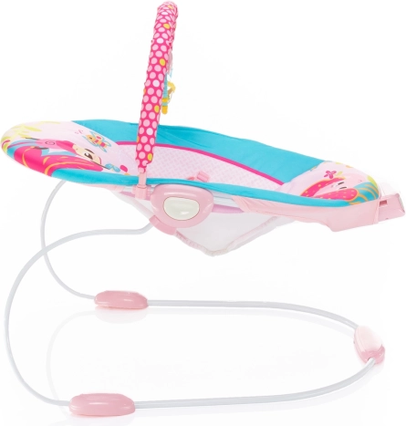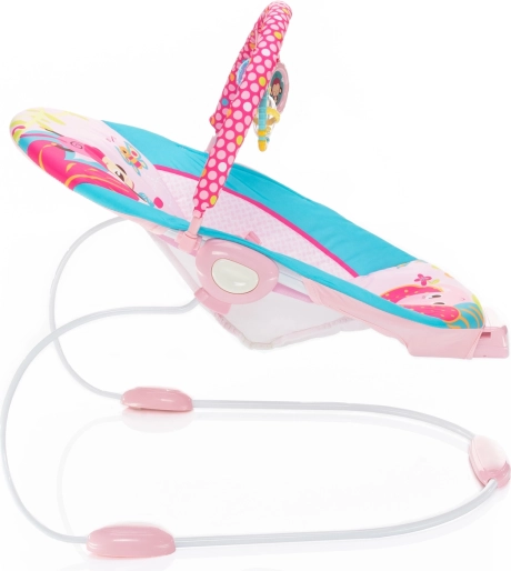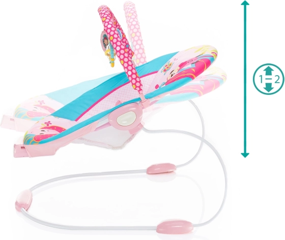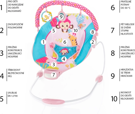 Sigurnost i udobnost osiguravaju 3-točkasti sigurnosni pojas i protuklizne nožice. Djeca mogu u potpunosti koristiti mehanizam ljuljanja ležaljke i uživati u prisutnosti prečke s trima igračkama koje razvijaju njihova osjetila i finu motoriku.