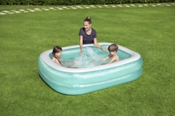 Praktičan i izdržljiv bazen u elegantnoj tirkizno-bijeloj boji idealan je za vruće dane u vrtu. Zahvaljujući mekim napuhanim stijenkama udoban je za djecu i siguran za obiteljske igre. Kada je složen zauzima minimalno mjesta, pa ga je lako prenijeti ili pohraniti.