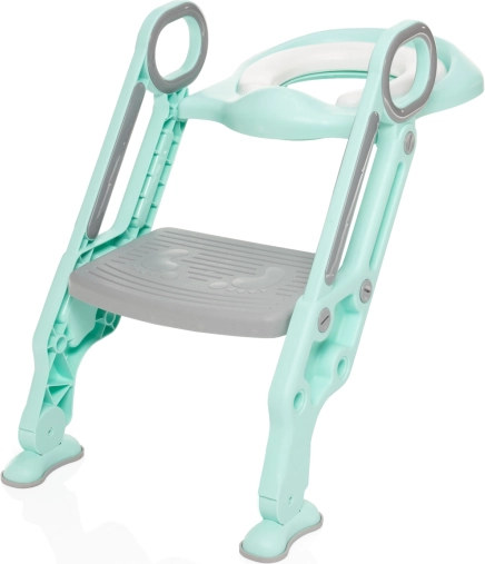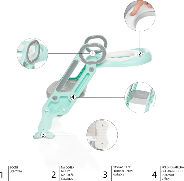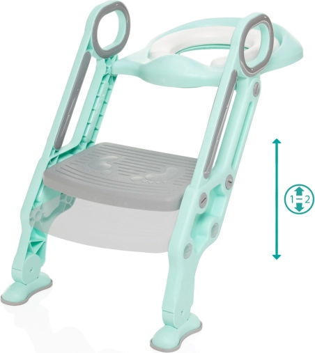 Stepenice zahvaljujući mogućnosti podešavanja visine rastu s vašim djetetom sve dok ih više ne bude trebalo. Čvrsta konstrukcija jamči da će se dijete pri penjanju i sjedenju osjećati sigurno. Noge su opremljene posebnom protukliznom površinom koja pruža osjećaj stabilnosti i oslonca. Dio stepenica je i mekano i udobno sjedište koje služi kao redukcija za klasični WC. Anatomski oblik sjedišta zajedno s povišenim stražnjim dijelom savršeno sprječava neželjeno zaprljanje.