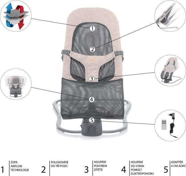 Odaberite prirodno ljuljanje pokretom djeteta ili elektromotor s pet razina intenziteta, timerom i automatskim pokretanjem.