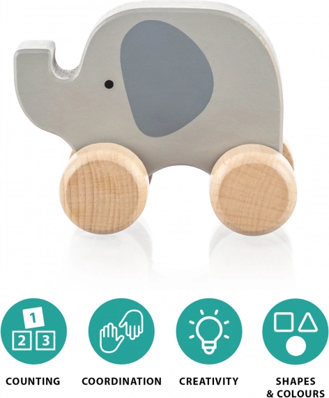 Lagan i kompaktan drveni slon sjajan je pratitelj za prve utrke u dječjoj sobi i na igralištu. Zahvaljujući glatkim rubovima i ergonomskom obliku dobro leži u malim ručicama te je spreman podržati samostalnu igru i prve korake.