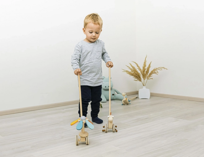 Čvrsta štap pruža podršku pri prvim koracima, s drvenom kuglom na kraju za veću sigurnost. Jahač je izrađen od izdržljivog drveta bez oštrih rubova, što osigurava dugotrajnost i sigurno igranje.