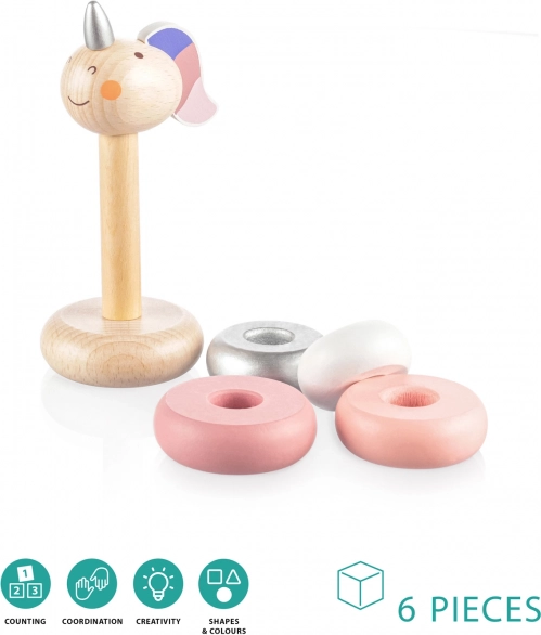 Dizajn u obliku jednoroga privlačan je najmlađima, a uz postav različitih veličina prstenova, dijete se lako uči osnovnom računanju i prepoznavanju veličina. Kvalitetna i izdržljiva izvedba s bojama na bazi vode osigurava sigurno igranje.