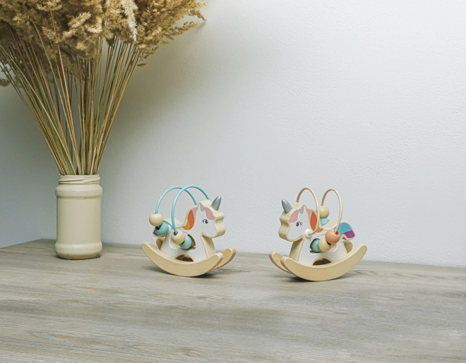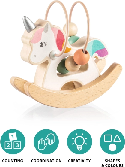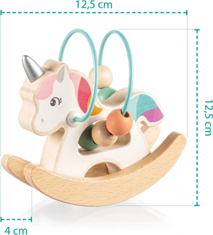 Drveni jednorog s aktivnostima osmišljen je da istovremeno zabavi i pouči. Djeca ovu kompaktnu igračku mogu lako uhvatiti, što je čini idealnim pratiteljem za njihove pustolovine. Osim klasičnog ljuljanja, jednorog nudi i interaktivne elemente koji razvijaju koordinaciju i kreativnost.